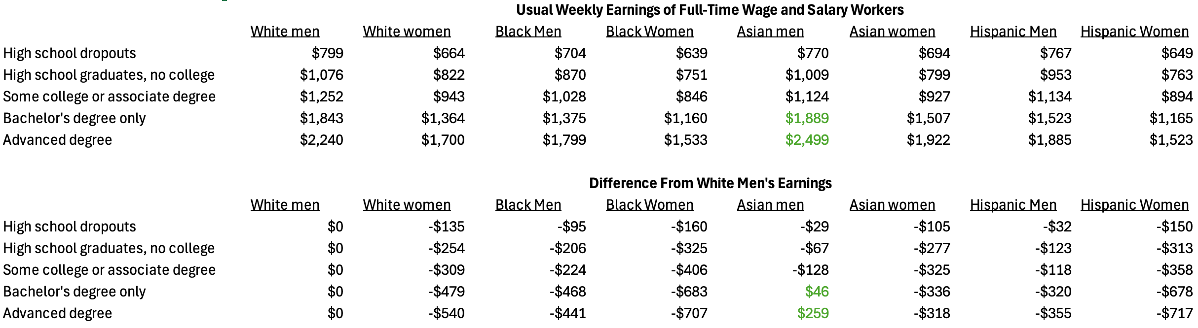 Just to drive this home, here’s the usual weekly earnings of full-time workers by their race, gender, and educational attainment. White men earn more than everyone else, with the exception of highly educated Asian men.