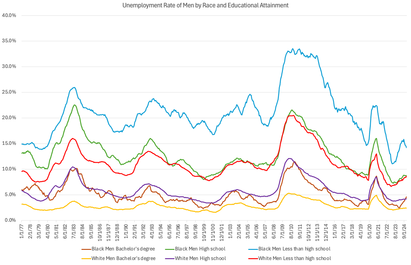 Let’s look at unemployment rates by race again, but this time show 1) just men and 2) look by educational attainment. In our labor market there is a basic fact that the more education you have, the easier it is to find a job. High school dropouts have the highest unemployment rate, individuals with an advanced degree have the lowest. This is always true at the group level, i.e. the unemployment rate for college graduates has never been higher than the unemployment rate for high school graduates within any group of workers.