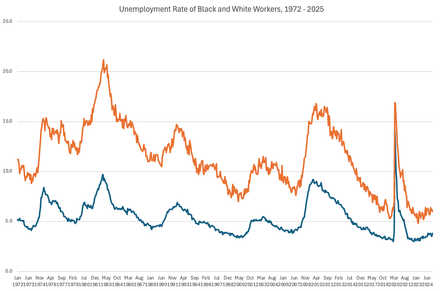 If there were a way to sum up the motivation for DEI in one figure, it would be this one: the unemployment rate of black and white workers since 1972. What you’ll notice is that the average black unemployment rate—in good times or bad, in past decades or the present—is twice the white unemployment rate, or higher.